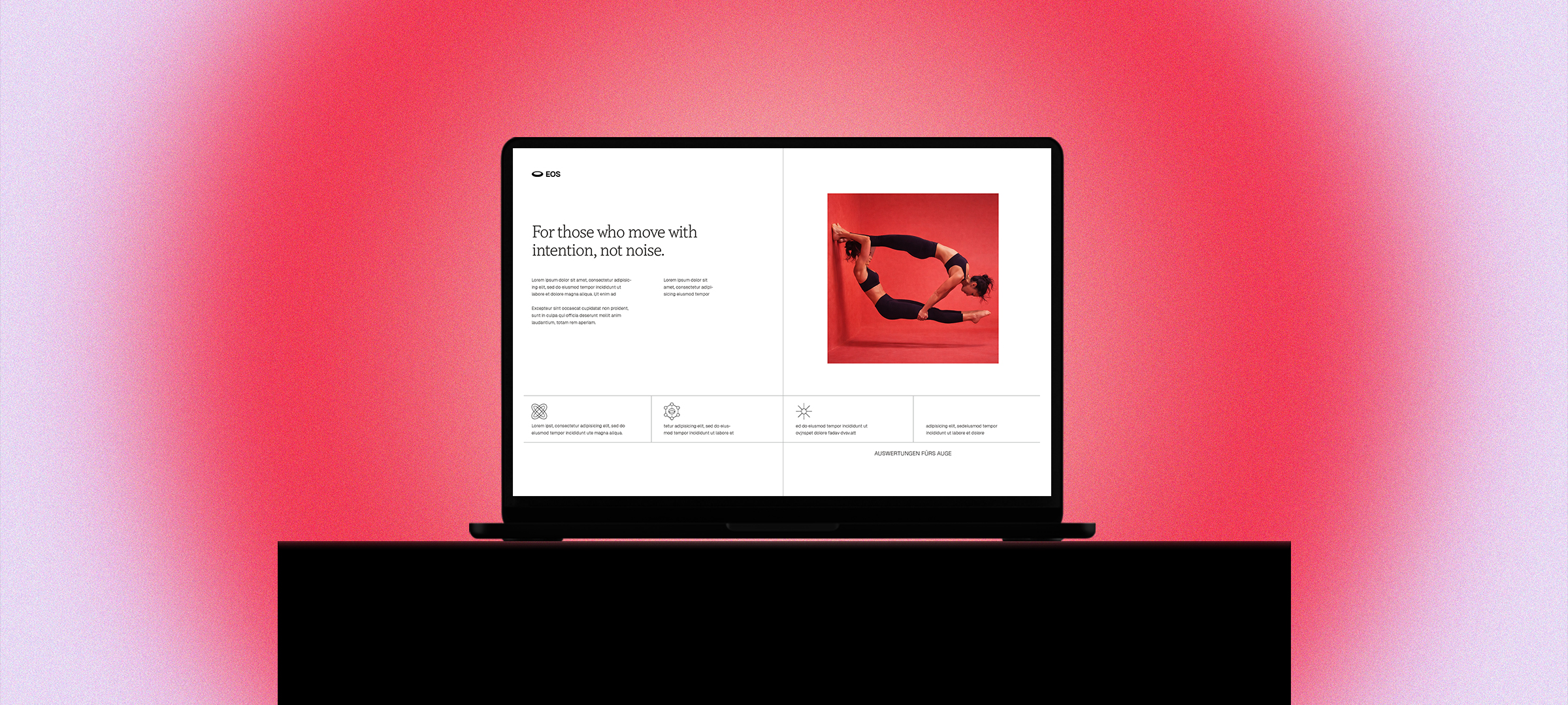 Der Markt ist voll von Räucherstäbchen-Spiritualität oder austauschbaren Boutique-Studios. EOS bricht damit. Kein „Yoga“, nicht Trendgetrieben, kein weichgespültes Wellness-Versprechen. Stattdessen ein klares Konzept aus Community, Qualität und Hilfe zur Selbsthilfe. Im Branding-Prozess haben wir Vision, Werte und Zielgruppe geschärft und EOS als Plattform für körperliche und mentale Entwicklung definiert.